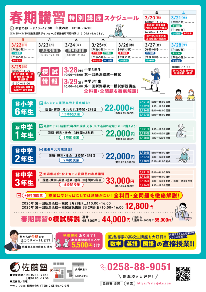 【長岡校】2026年度春期講習のご案内 2026 2/13 佐藤塾情報 2026年2月12日2026年2月13日 定員に達し次第受付終了となります。 お問い合わせ 佐藤塾情報 よかったらシェアしてね! URLをコピーしました! URLをコピーしました!